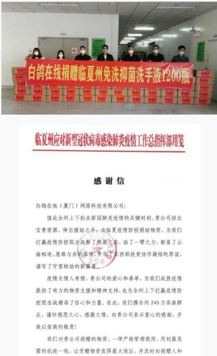 2月17日,白鸽在线向厦门市对口支援的甘肃临夏州捐赠1200瓶抑菌消毒喷雾,价值8.16万元。为当地群众输送防疫物资,更传递了厦门市政府及白鸽在线对当地民众的关心与慰问,携手当地群众共同战疫,做到防疫扶贫两不误。
