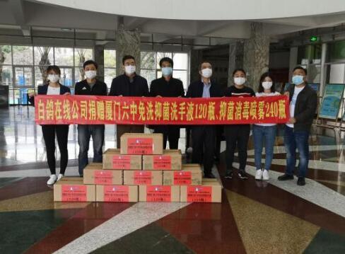 3月2日,为保证复学后学校各项基础防疫防控工作有所保障,白鸽在线党支部书记、新冠疫情防控工作小组总指挥涂锦波董事长带领小组成员亲临厦门六中,关心学校复学情况,并捐赠120瓶免洗抑菌洗手液、240瓶抑菌消毒喷雾、1000个一次性医用口罩,总价值22520元,助力校园疫情防控工作。