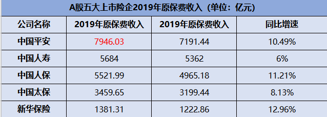 2019年,A股5家上市险企(国寿、平安、太保、人保、新华保险)公布了2019年全年保费收入。其中,中国平安保费收入7946亿元,位居第一。