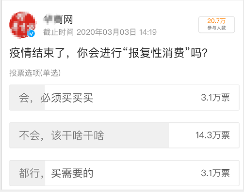 另一社交平台上的一项投票#疫情结束了,你会报复性消费吗?#,超过一半的网友表示:不会,该干啥干啥。