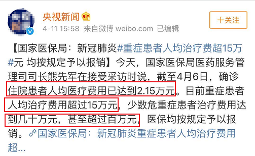 截至4月6日,确诊住院患者人均医疗费用为2.15万元;重症患者人均治疗费用超过15万元;少数危重症患者治疗费用达几十万元,甚至超过百万元。