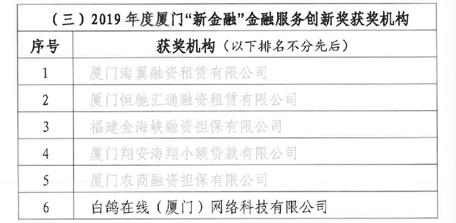 (截取自《关于2019年度厦门地方金融业评优评先结果的通报文件》)