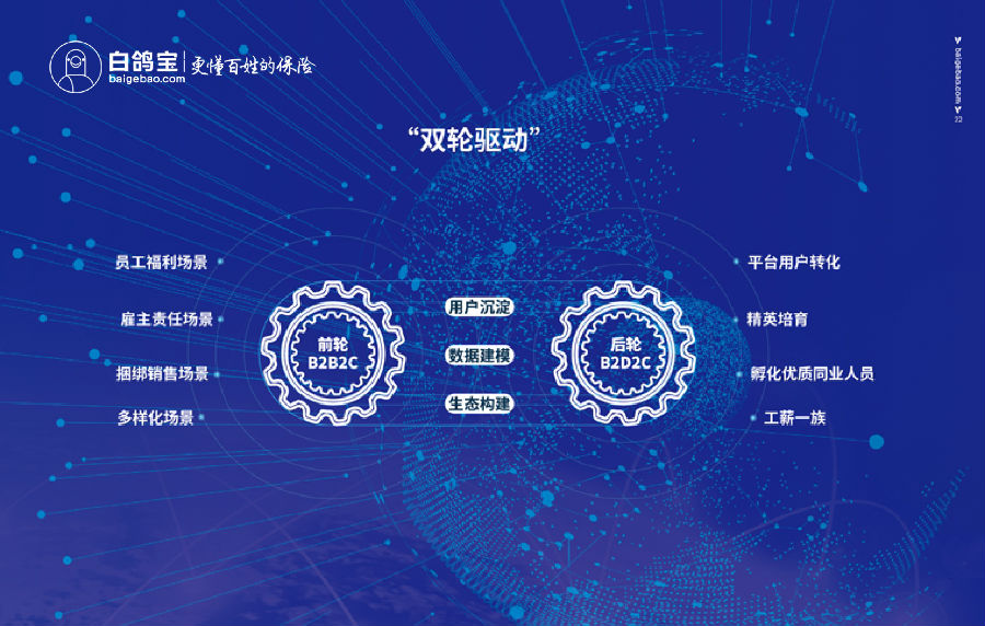 “高效的技术驱动配合精准的业务策略,是白鸽宝制胜的关键。”白鸽宝董事长涂锦波表示。借助大数据、人工智能、云计算等技术的赋能,互联网保险公司和平台在产品创新、营销宣传、开辟渠道等方面不断发力,在不同细分领域及环节建立了独特的市场竞争力。与此同时,在市场前期红利被持续释放后,各方为争夺市场份额均在寻求新的增长点。在公司发展的初期,白鸽宝对于商业模式的选择也曾有过多番的思考。在实际运营的过程中发现光靠自身企业的服务通过互联网直接进行用户触达,获取流量的C端道路依然曲折。在不断探索和实践中,白鸽宝依靠自身产品优势及敏锐的市场洞察,最终形成了“以B2B2C为前轮,B2D2C为后轮”的双轮驱动业务发展策略。两个业务板块的协同构成了白鸽宝特有的发展模式,双轮业务基于白鸽完整的场景化SaaS云平台全流程服务生态,为客户提供提供金融赋能与科技赋能解决方案,沉淀用户数据、最终完成多场景叠加下的用户价值再创造,实现风险生态的构建。