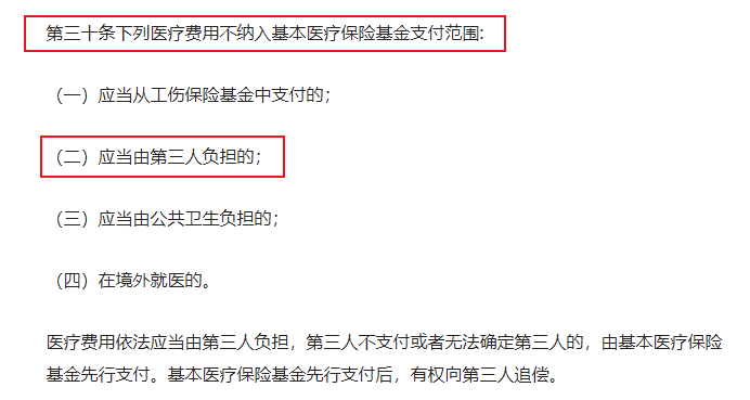 医保并不是有些朋友所认为的什么都管。比如走在路上不小心被车给撞了或者被歹徒伤害了,受伤了需要治疗,这个医保就不管了,因为这个属于第三者的责任,要由肇事的第三者来赔偿。除非找不到第三者或者认定有困难,才暂时由医保垫付。这是其一。