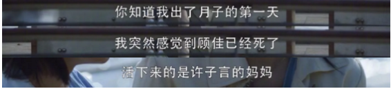 顾佳说:“我出月子的第一天,我突然感觉到顾佳已经死了,活下来的是许子言的妈妈。”