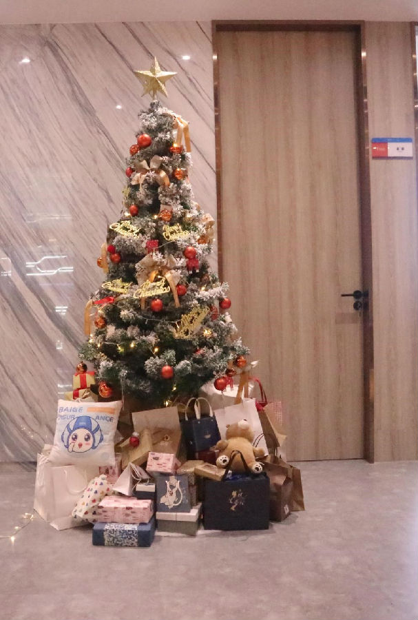 圣诞节前一周,行政部的小伙伴们便开始了职场的布置工作,电视屏、绿植、大门都统一换上了圣诞的装饰元素,一颗挂满灯带与装饰物的圣诞树更是将圣诞气氛烘托至极致。白鸽在线的小伙伴们纷纷在树下合影留念,并期待即将到来的圣诞节。