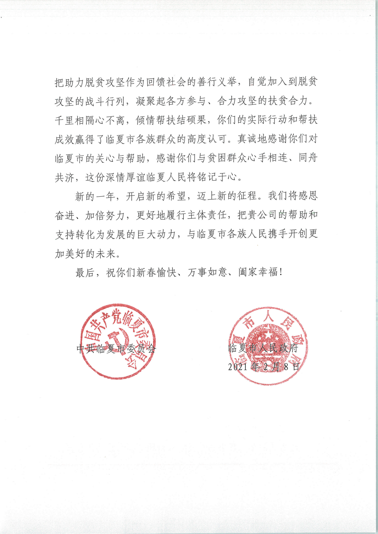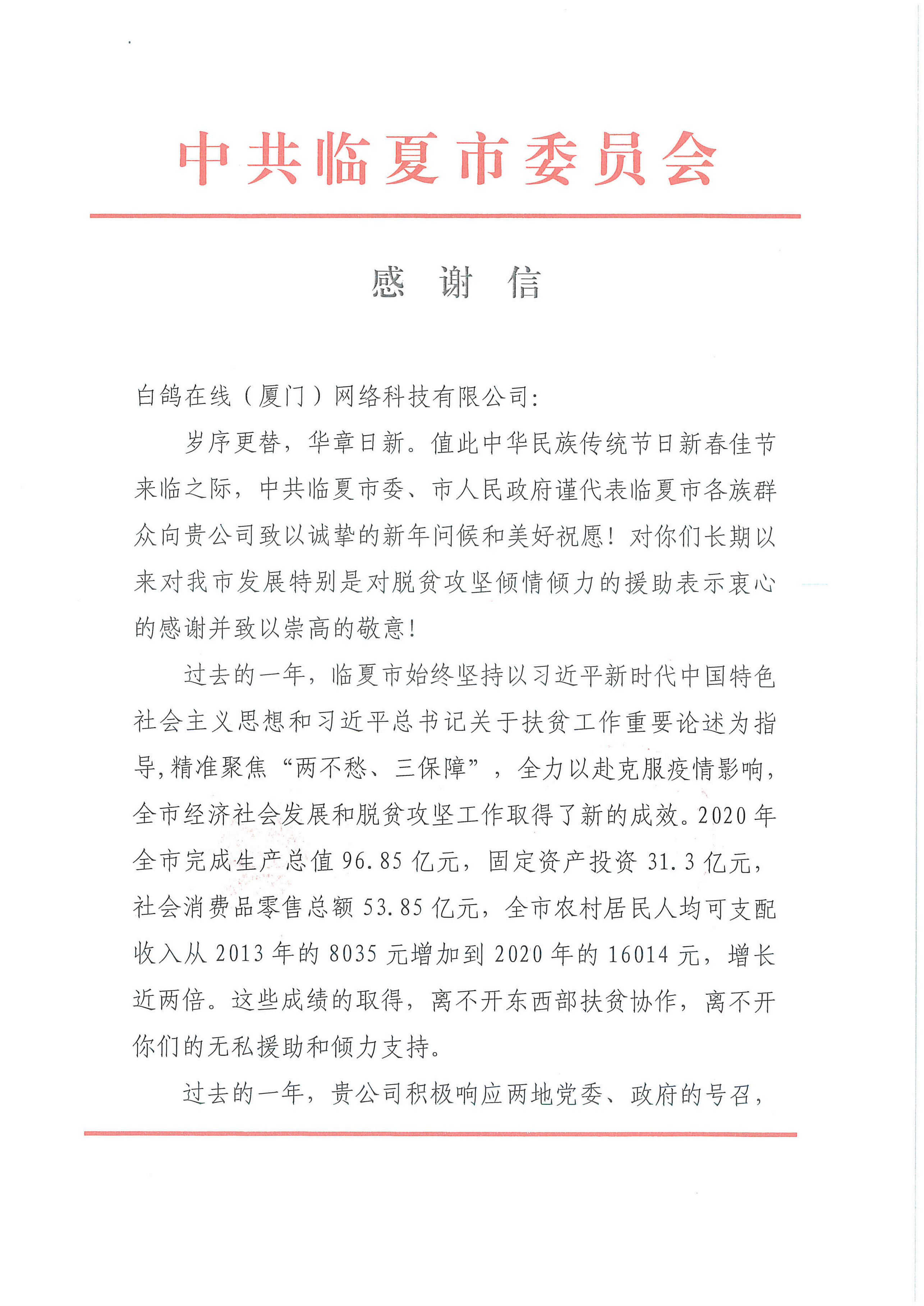 信中临夏市政府对近年来白鸽在线响应扶贫号召援助临夏市的举措表示由衷的感谢,同时为白鸽在线送上一份温暖的新春祝福,期盼在新的一年中仍与白鸽在线心手相连,同舟共济。这份书信对于白鸽在线有着莫大的意义,不仅是对白鸽在线践行善举的肯定,同时也让白鸽在线更加坚定了在这条充满爱的公益道路上走下去的信心。
