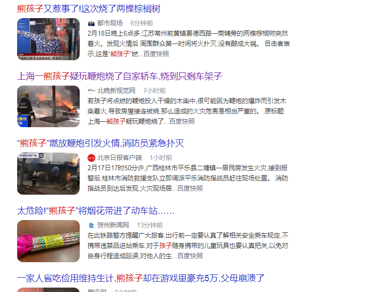 2月9日,四川两小孩在火锅店连开59瓶香油,父母无奈全部买单,除饭钱外还得另付206.5元;2月13日,山东一7岁的男孩,趁爸妈不注意独自离家去走亲戚,幸好被民警寻回,平安送到家里;2月16日,上海一熊孩子玩鞭炮烧了自家轿车,车子被烧到只剩一个车架子……