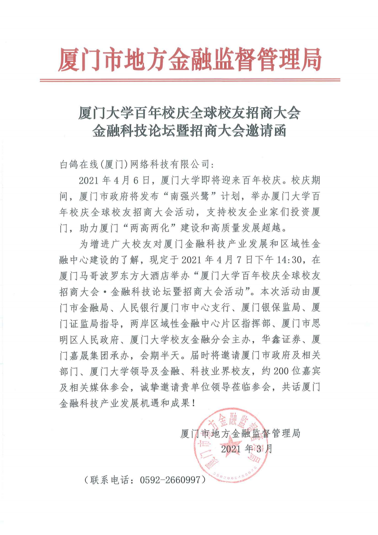 1921年4月6日,爱国华侨领袖陈嘉庚创办成立厦门大学。一个世纪之后的今日,厦门大学即将迎来100周年校庆。在厦门市政府“南强兴鹭”计划的号召下,白鸽在线(厦门)网络科技有限公司(以下简称“白鸽在线”)参与协办并受邀参加厦大100周年校庆活动——金融科技论坛暨招商大会。