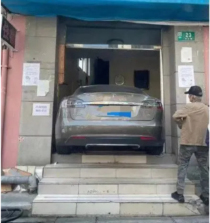 5月10日,一张特斯拉停在上海一处门面房入口台阶上的照片在网上疯传。