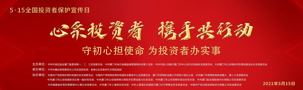 2021年5月15日是我国第三个“全国投资者保护宣传日”,由中共中国证监会厦门监管局第一、二、三支部委员会、中共厦门市地方金融监督管理局机关第三支部、中共中国人民银行厦门市中心支行反洗钱支部党委会、中共厦门市公安局经济犯罪侦查支队总支部委员会主办,中共华鑫证券有限责任公司总部四支部、金榜山社区新时代文明实践站承办的“心系投资者,携手共行动”主题活动于厦门市思明区新时代文明实践中心·金榜书院圆满落下帷幕。