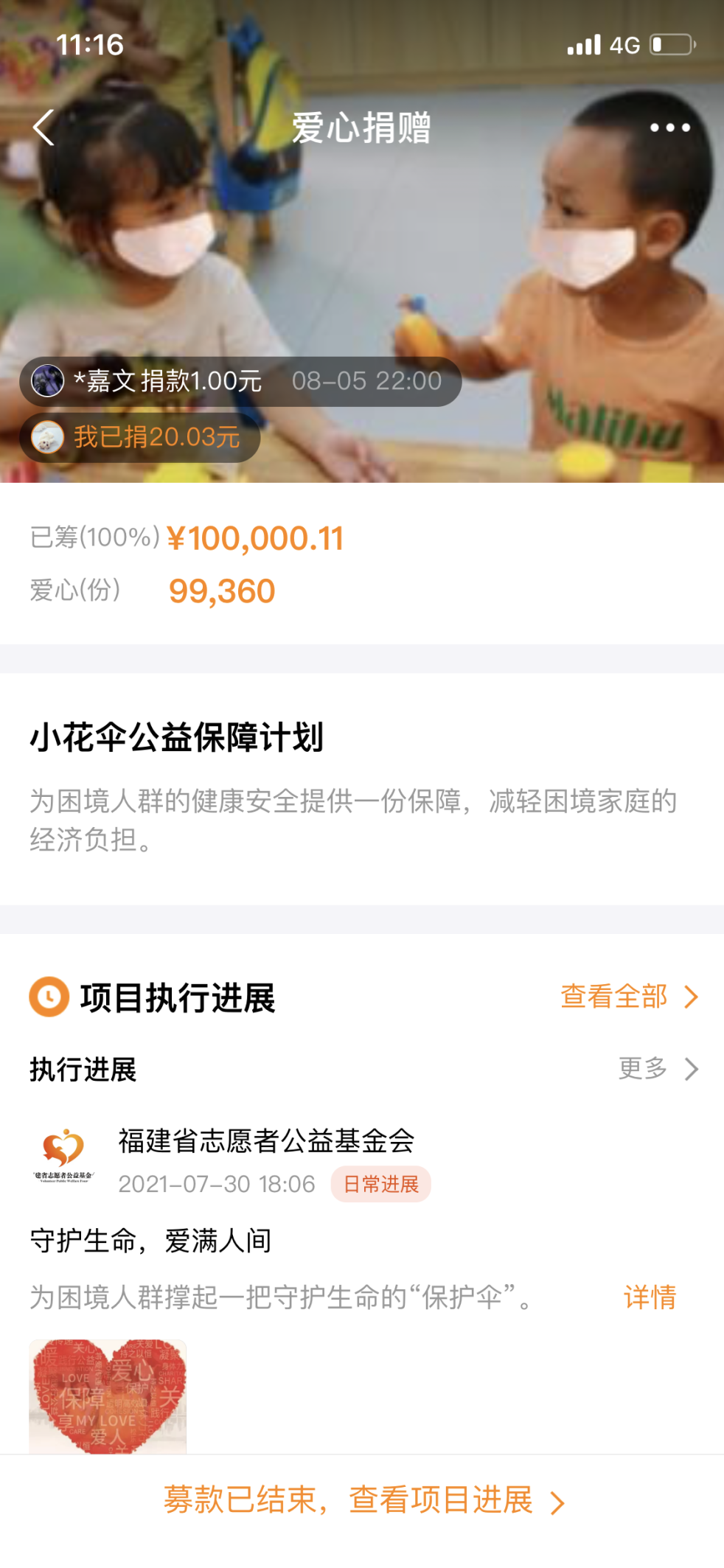 活动至筹款截至共收获了99360份爱心,有共产党员的大爱担当,有优秀企业家的倾情奉献,有志愿者的真挚情怀,更有爱心人士的美好心愿……无数善心和爱意汇聚成汩汩暖流,凝聚成撑起爱心“小花伞“的团结之力,为更多家庭及祖国的花朵保驾护航。
