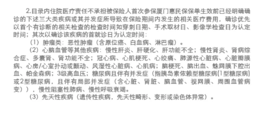 3、惠民保对既往病症的约定宽松,一般来讲,百万医疗对于任何既往症所产生的医疗费用是不赔付的,但是惠民保在这块的理赔要求较为宽松。此次厦门惠民保,关于住院医疗费用部分,除恶性肿瘤,心脑血管等其他疾病及先天性疾病三大类既往症外,其他既往病症都是支持赔付的;