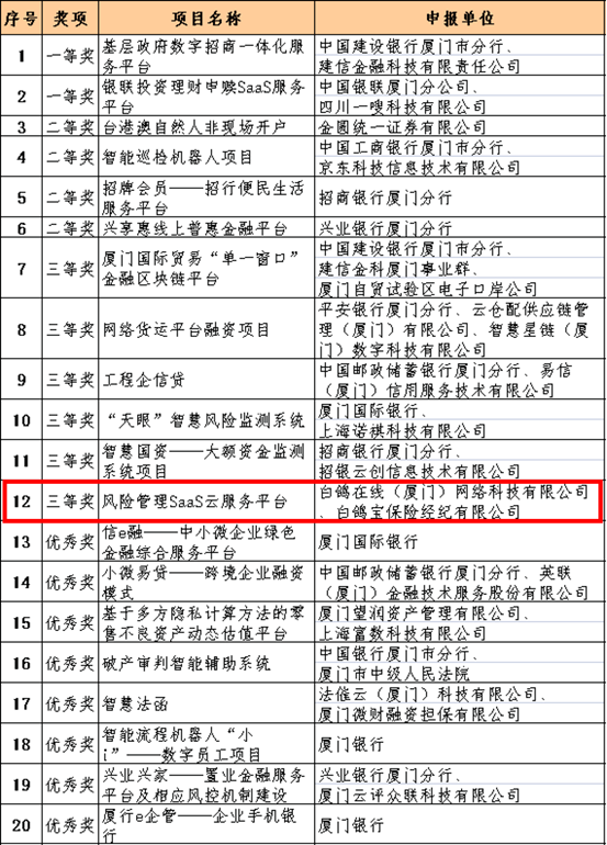 近日,根据《关于组织申报第二届厦门市金融科技优秀项目的通知》(厦金联〔2021〕6号),经专家组初审、复审,共评选出20个拟获奖项目。其中,白鸽在线(厦门)网络科技有限公司及白鸽宝保险经纪有限公司(以下均简称“白鸽”)研发的风险管理SaaS云服务平台——“白鸽e保”荣获了三等奖(唯一保险科技项目)。