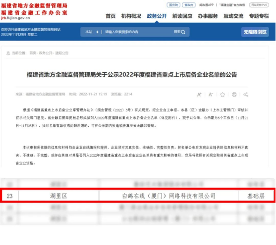 近日,福建省地方金融监督管理局公示了2022年度福建省重点上市后备企业名单,白鸽在线(厦门)网络科技有限公司(以下简称“白鸽在线”)位列其中。
