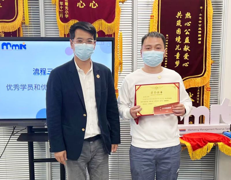 随后,白鸽在线董事长涂锦波向合格学员颁发MMRT班徽、结业证书。此次的班徽授予仪式代表着12名学员们正式成为一名合格的营销管理储备干部,未来他们将在岗位上学以致用,发光发热,为白鸽在线带来新的业务增长曲线。