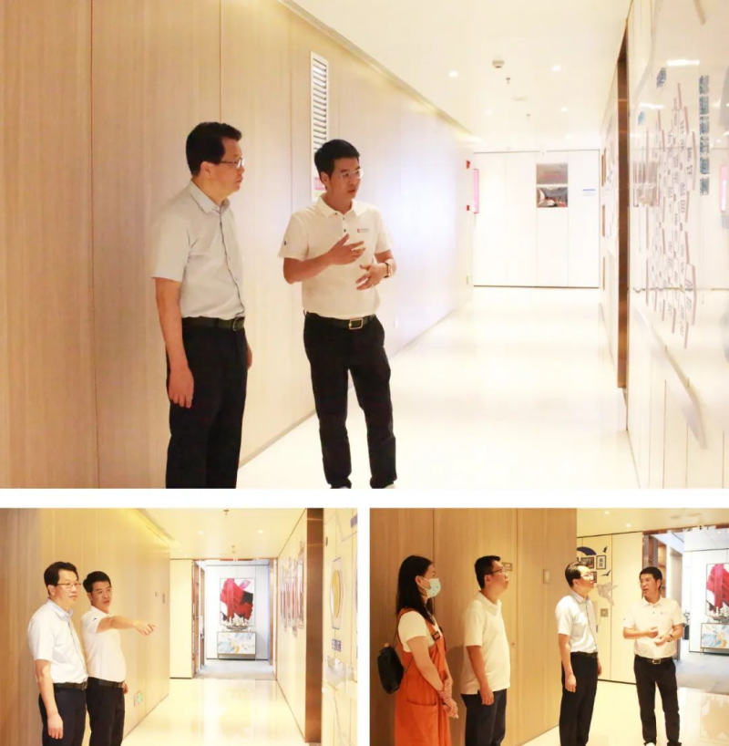 黄奋强一行首先参观了白鸽天地金融(保险)科技产业园。自2021年建设与运营以来,产业园取得了省、市、区各级政府的指导与支持,成为了首批引育科创产业重点服务机构,并联合高校着力培育一批数字人才,在激发地区科创活力、赋能市级金科创新发展起着重要的作用。