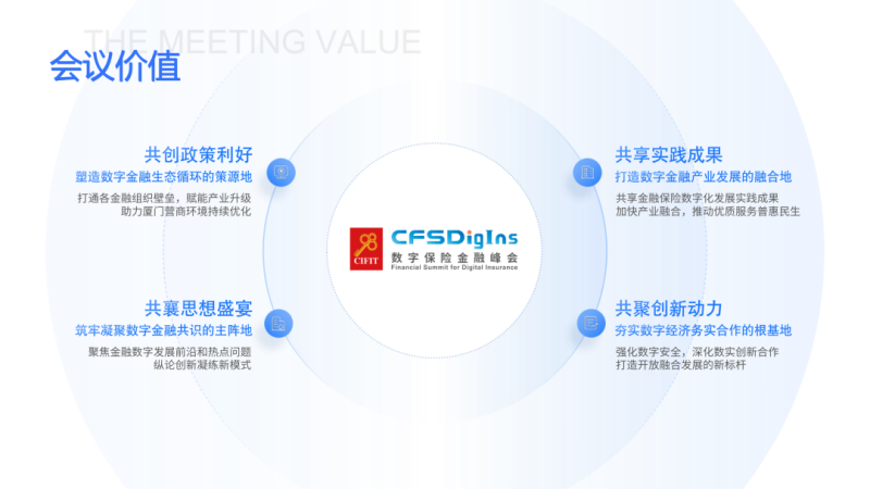 数字保险金融峰会作为中国国际投资贸易洽谈会的平行论坛之一,是厦门金融科技创新的新名片,也是观察行业科技创新的重要窗口。第三届数字保险金融峰会持续贯彻落实“数字中国”、“数字福建”、“数字厦门”建设要求,推动金融行业全面数字化转型,以数字经济赋能金融服务,为实体经济发展提供更优质的金融服务和更广阔的金融创新空间。