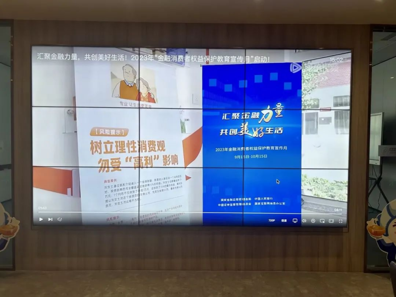 线下,通过产业园LED大屏循环播放金融知识普及视频和宣传海报,从视听角度丰富金融教育的宣传资料,加强金融知识传播,在无形之中加强消费者的金融安全意识。