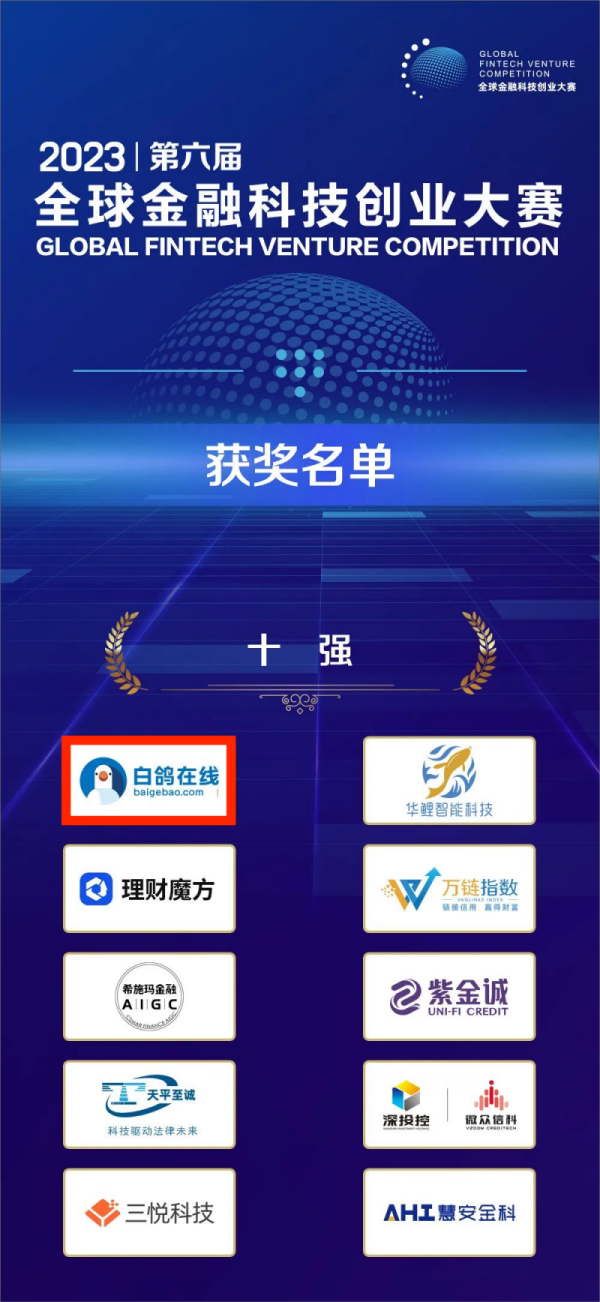 近日,由清华大学金融科技研究院作为学术指导发起、北京金融科技研究院指导、北京清芬新金融研究院主办的2023第六届全球金融科技创业大赛总决赛圆满结束,白鸽在线(厦门)网络科技有限公司(以下简称“白鸽在线”)荣获“金融科技10强企业”。