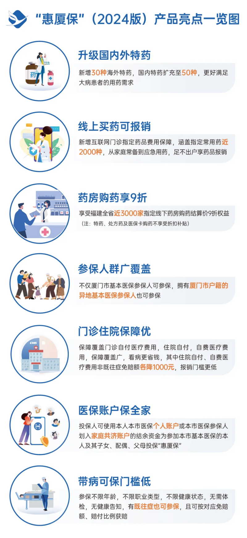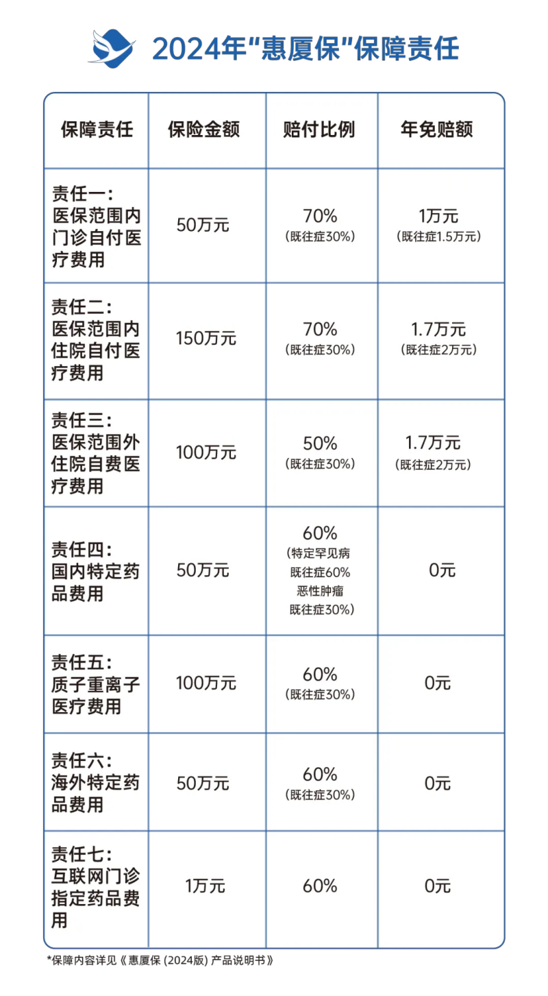 目前,“惠厦保”(2024版)已全面开启参保通道,保费不变,仍为129元/人/年(2023年7月1日及之后出生的新生儿保费为每人99元/年),但全年最高保障额度再提升,保障涵盖医保内外7类保障,包含医保范围内门诊和住院的自付医疗费用、医保范围外住院自费医疗费用、质子重离子医疗费用、50种国内特定药品费用、30种海外特定药品费用、互联网门诊指定药品费用。