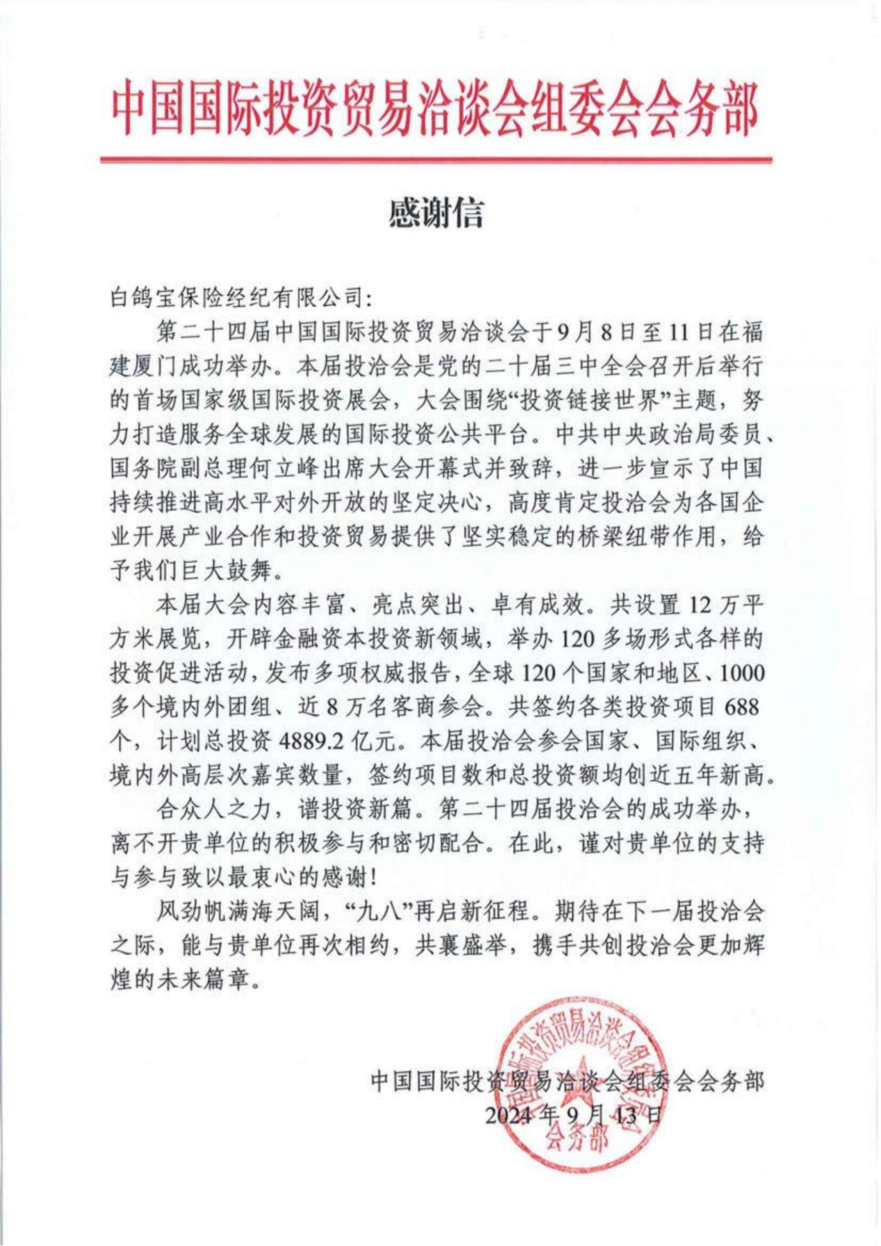 2024年9月8日至11日,第24届中国国际投资贸易洽谈会(以下简称“投洽会”)在厦门举办,本届投洽会以“投资链接世界”为年度主题,展览总面积达到12万平方米,分为投资促进、产业创新发展、项目资本对接三个主题展馆,聚焦“引进来”和“走出去”两大核心主题,致力于打造双向投资促进、权威信息发布和投资趋势研讨三大平台。120个国家和地区、18个国际组织、1000多个境内外政府机构及工商企业团组、近8万名客商参展参会。