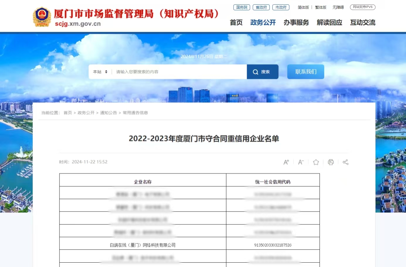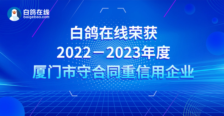 近日,厦门市市场监督管理局公布了“2022-2023年度厦门市守合同重信用企业名单”,白鸽在线成功入选。