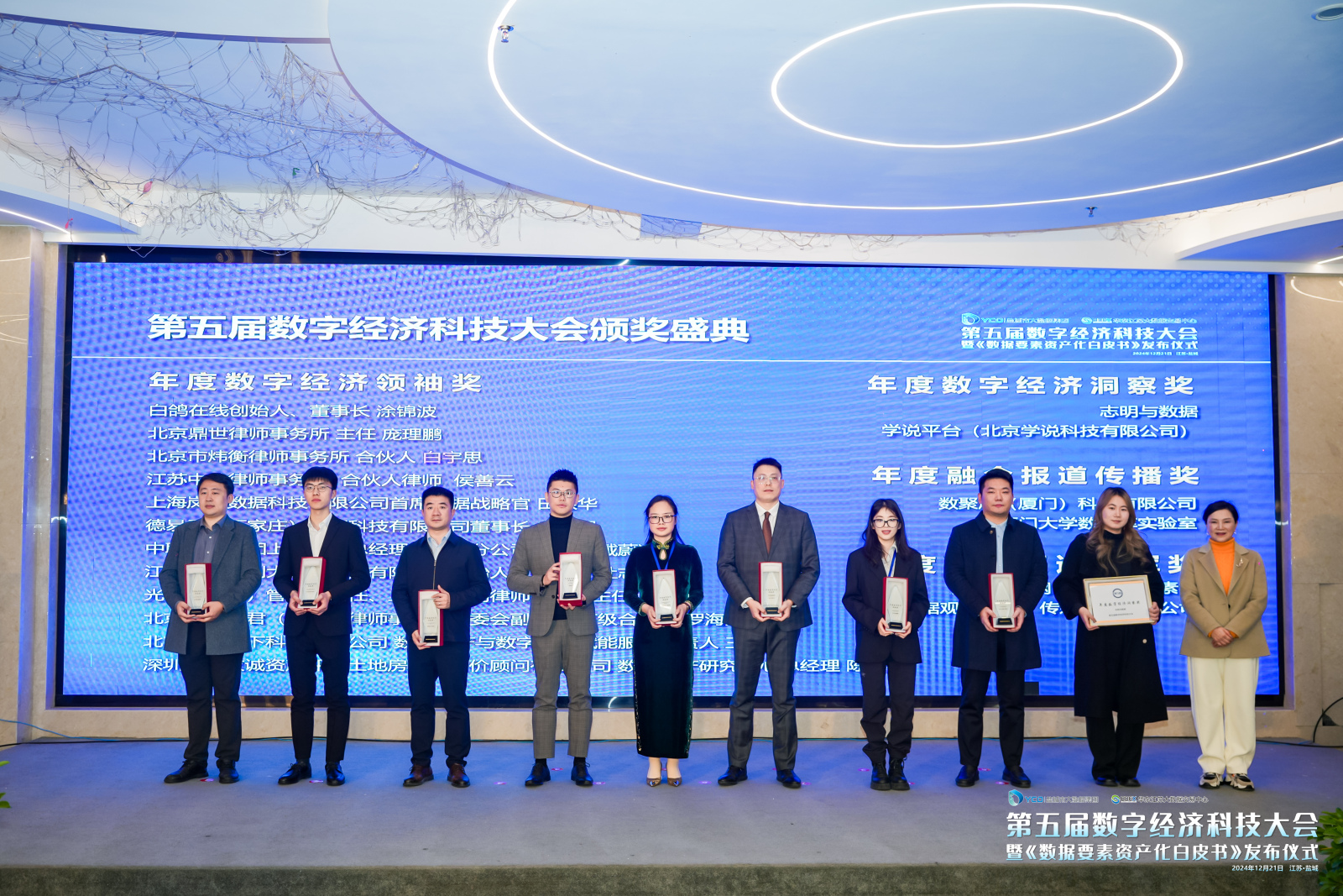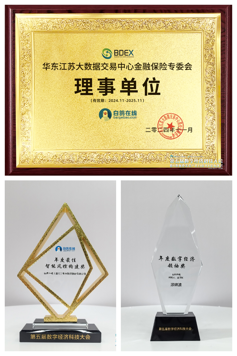 本次会议聚焦数字经济产业的全链条配置及数据生态全面构建多个维度,探讨数据交易与流通的新模式、新路径。会上,白鸽在线凭借在数据治理、数据风险管理等领域取得的优异成绩,荣获华东江苏大数据交易中心金融保险专委会“理事单位”与“年度最佳智能风控构建奖”,白鸽在线创始人、董事长涂锦波获得了“年度数字经济领袖奖”。