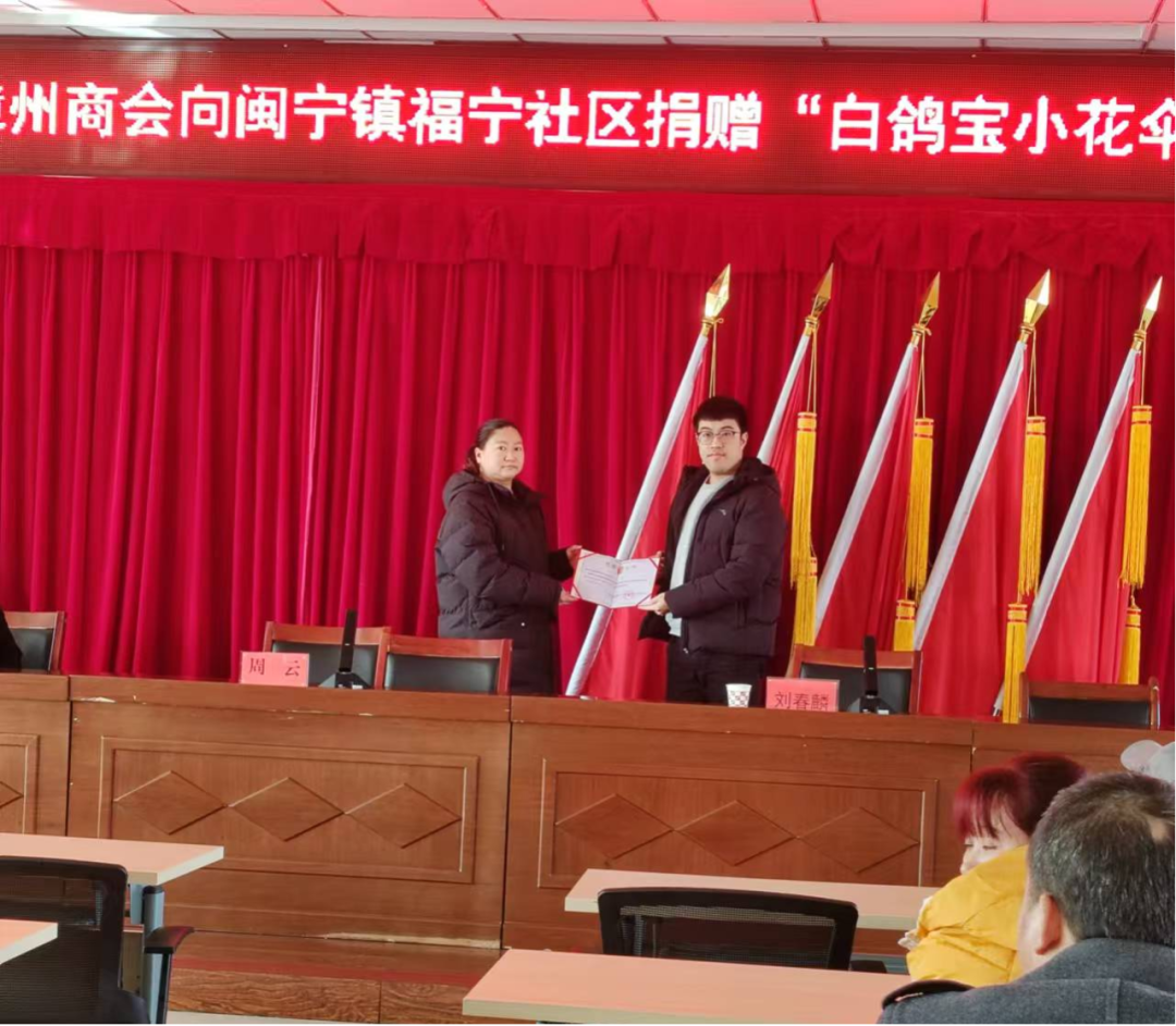 (图为福宁社区驻村第一书记周云为厦门市白鸽慈善会及厦门市漳州商会颁发捐赠证书)