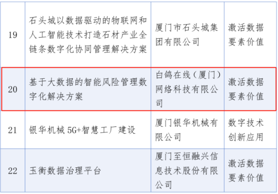 为总结推进数字厦门建设阶段性成果,以标杆示范引领促进经验分享和交流合作,近日,厦门市数据管理局公布了2024数字厦门建设成果入选名单。经层层遴选,共评选产生50个数字厦门建设成果,其中,白鸽在线以《基于大数据的智能风险管理数字化解决方案》作为激活数据要素价值领域的优秀解决方案入选。