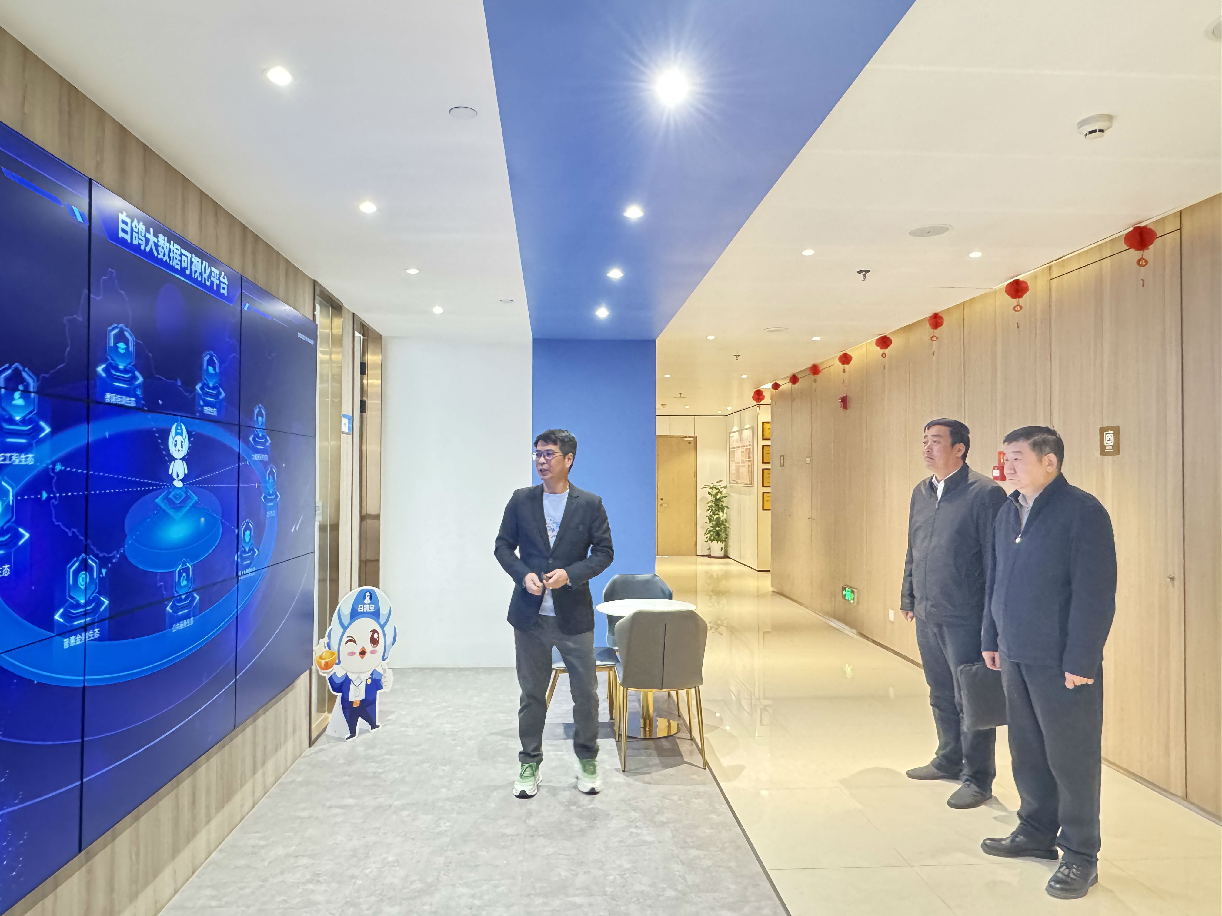 孔曙光一行先后参观了白鸽天地金融(保险)科技产业园与白鸽在线总部大数据可视化平台、公司发展、企业荣誉墙以及生态合作伙伴建设等,详细了解白鸽在线在科技金融、数字化风险管理、大数据与人工智能等领域的技术创新和科研进展,听取了白鸽在线董事长涂锦波的成果汇报。