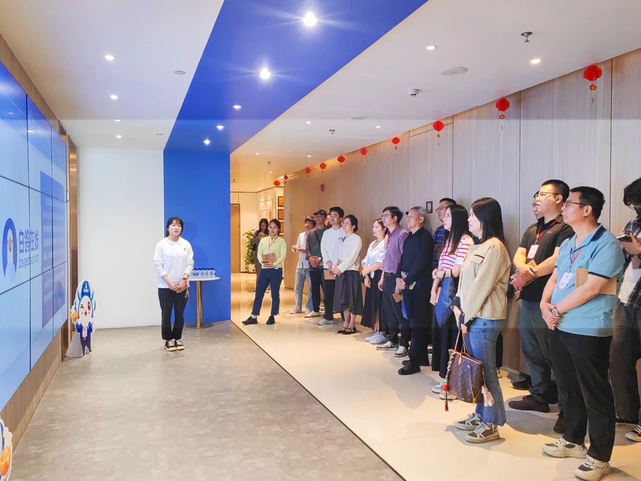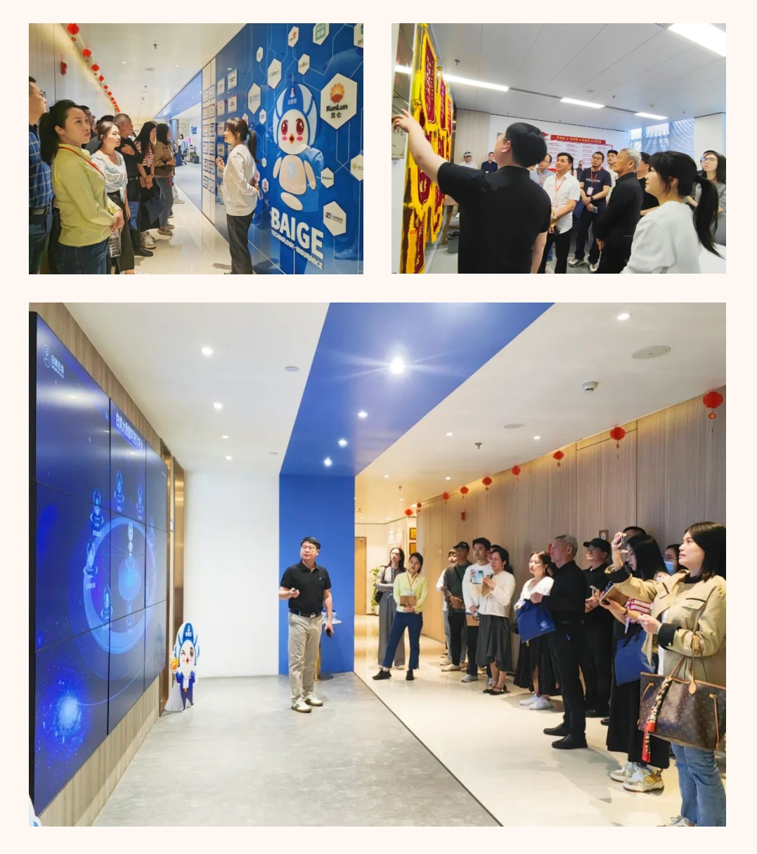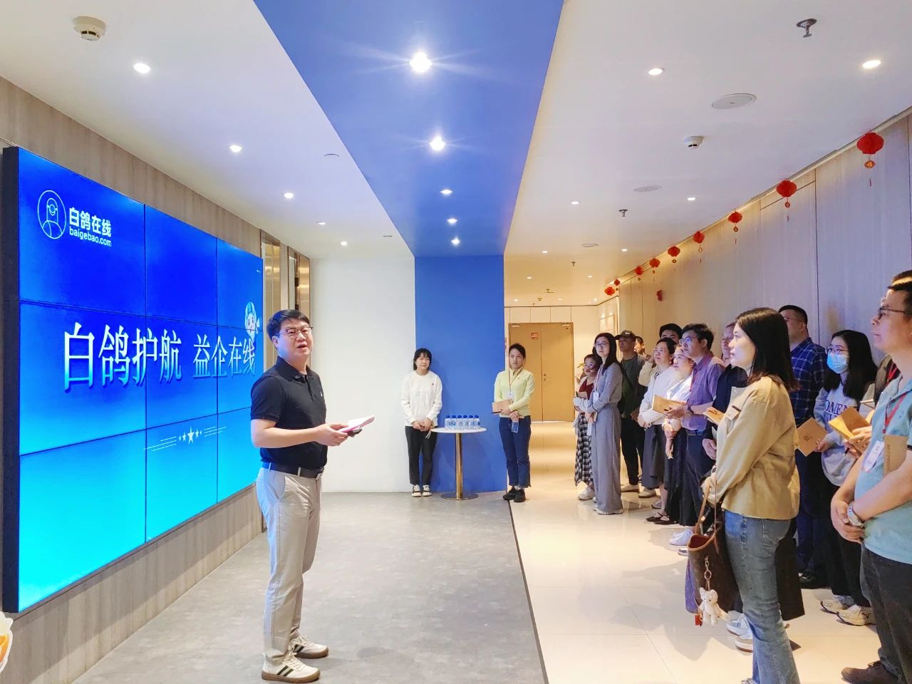 学员们还实地参观了白鸽在线企业党建文化墙、党员先锋岗及党建活动室等。陈少煌通过大数据可视化平台展示了白鸽在线数字化风险管理解决方案与“9+N生态建设”项目案例,凸显“双轮驱动”模式下企业党建与业务深度融合的实践成果。