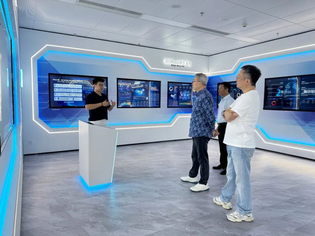 刘绪铭一行参观了白鸽在线AI展厅及企业总部,全面了解其数字化实践成果。柯葳彬详细介绍了白鸽在线通过“9+N”生态应用场景赋能政企数字化转型的案例,重点分享了在虚拟资产交易、支付清算、零散用工等场景的风险管理解决方案。