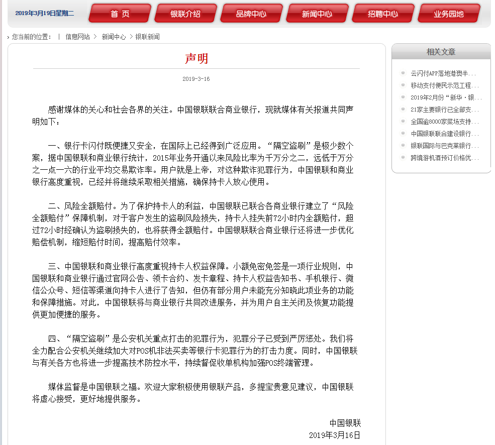 银联认为,首先,银行卡闪付既便捷又安全,在国际上已经得到广泛应用。“隔空盗刷”是极少数个案,据中国银联和商业银行统计,2015年业务开通以来风险比率为千万分之二,远低于万分之一点一六的行业平均交易欺诈率。其次,银联承诺风险全额赔付。为了保护持卡人的利益,中国银联已联合各商业银行建立了“风险全额赔付”保障机制,对于客户发生的盗刷风险损失,持卡人挂失前72小时内全额赔付,超过72小时经确认为盗刷损失的,也将获得全额赔付。第三,中国银联和商业银行高度重视持卡人权益保障。小额免密免签是一项行业规则,中国银联和商业银行通过官网公告、领卡合约、发卡章程、持卡人权益告知书、手机银行、微信公众号、短信等渠道向持卡人进行了告知,但仍有部分用户未能充分知晓此项业务的功能和保障措施。对此,中国银联将与商业银行共同改进服务,并为用户自主关闭及恢复功能提供更加便捷的服务。最后,“隔空盗刷”是公安机关重点打击的犯罪行为,犯罪分子已受到严厉惩处。银联将全力配合公安机关继续加大对POS机非法买卖等银行卡犯罪行为的打击力度。同时,中国银联与有关各方也将进一步提高技术防控水平,持续督促收单机构加强POS终端管理。